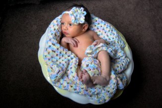 I have lots of photo session ideas for my Isabel and taking photographs of Isabel in the wash basin is just one of many. The wash basin is part of a pitcher and basin set that used to belong to my Grandma. Here’s my favorite photo from our session today. I crocheted the blanket and headband for Isabel.